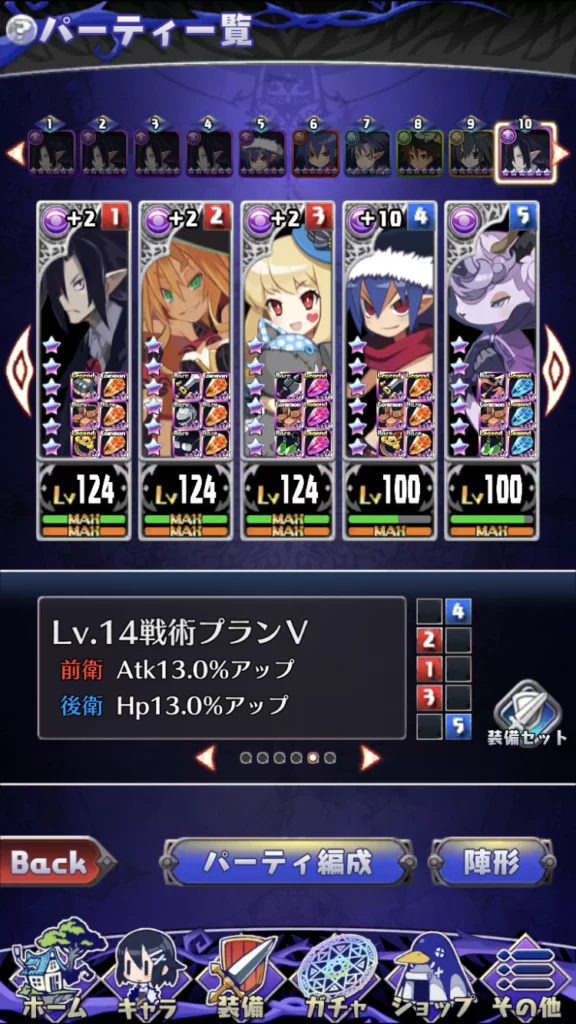 ▼パーティ一覧画面 、バトルの出発準備の画面にキャラの装備表示を追加しました