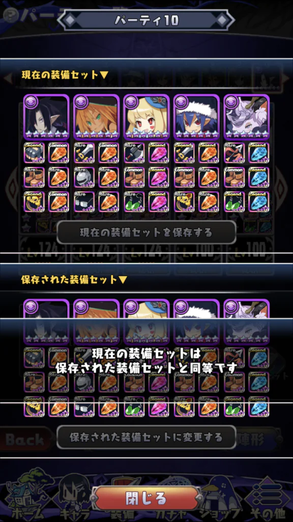 装備セットの画面で、「現在の装備セットを保存する」を押すと、編成されているキャラたちの装備を保存することができます
