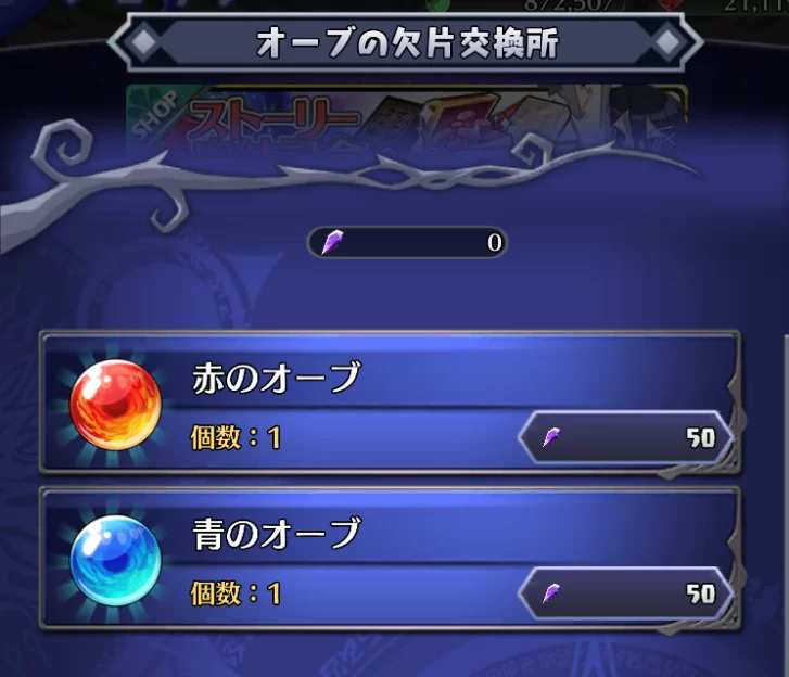 ショップ「オーブの欠片交換所」では「赤のオーブ」「青のオーブ」をそれぞれ交換可能です