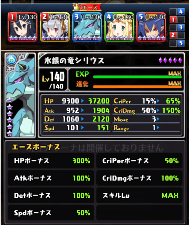 パーティの中で1体を「エースキャラ」として設定し、 「エースキャラ」にはステータスにボーナスが付きます