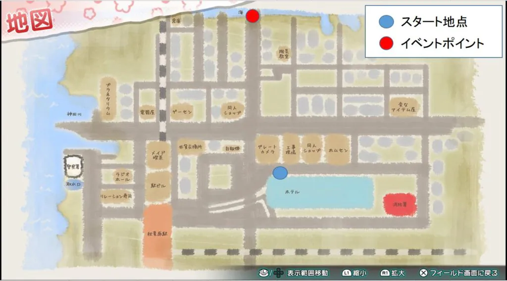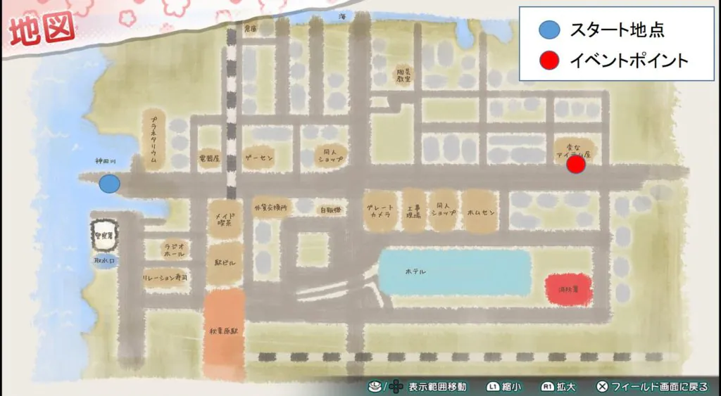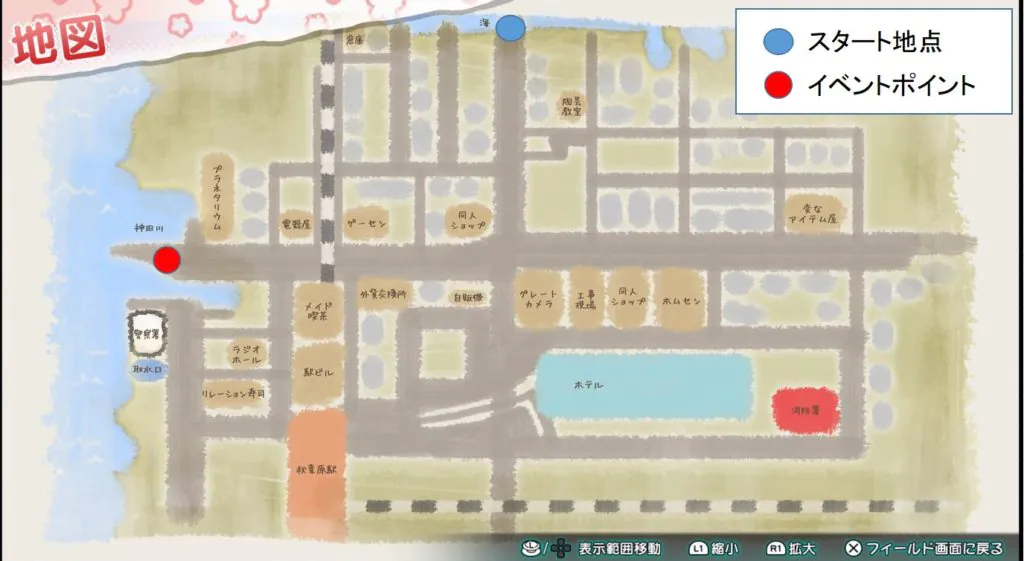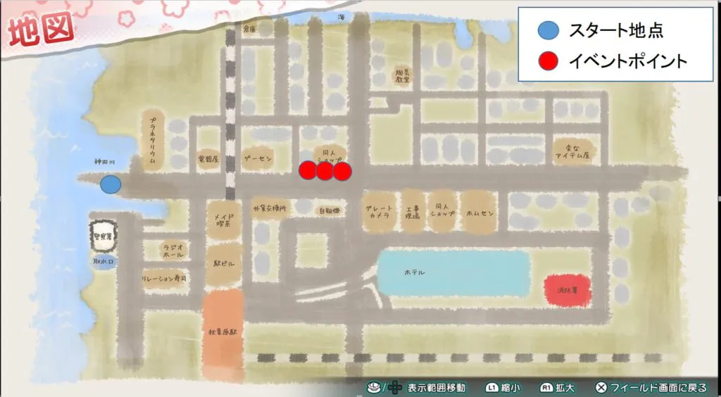 大通り上側の同人ショップ前3か所でイベントを発生させる
