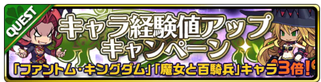 期間中、「ファントム・キングダム」「魔女と百騎兵」キャラの「ストーリー」「SPクエスト」「強化・素材ダンジョン」で入手できるキャラ経験値が3倍にアップします