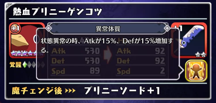 魔チェンジ例:冷徹プリニーサンカクが仲間で、さらに冷徹プリニーサンカクの召喚石が500個ある場合