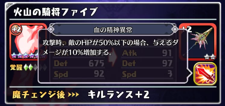 攻撃時、敵のHPが50%以下の場合、与えるダメージが10%増加する