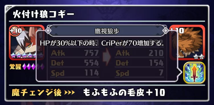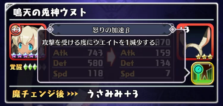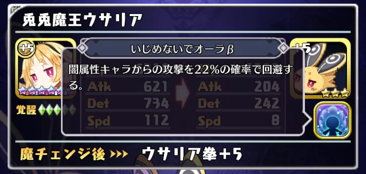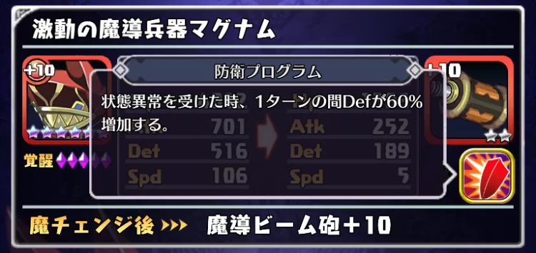 魔チェンジを行うと、キャラの覚醒数がそのまま魔装備の強化値になります