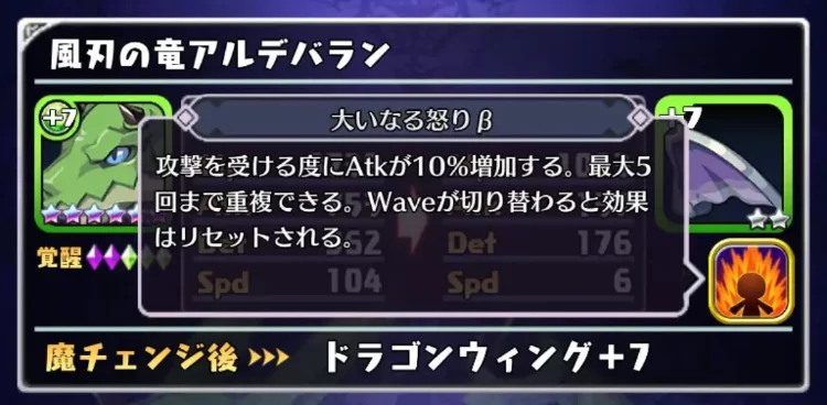 攻撃を受ける度にAtkが10%増加する。最大5回まで重複できる。Waveが切り替わると効果はリセットされる