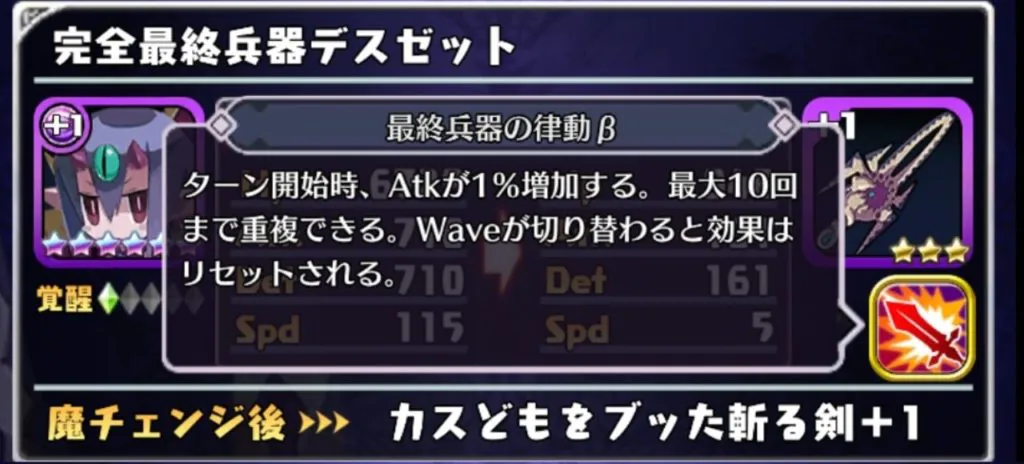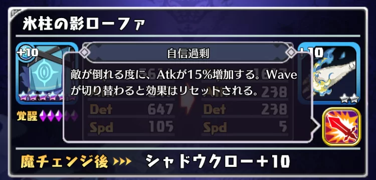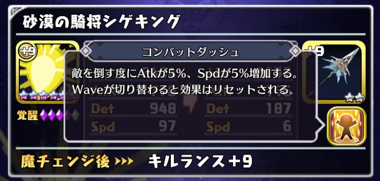 敵を倒す度にAtkが5%、Spdが5%増加する。Waveが切り替わると効果はリセットされる