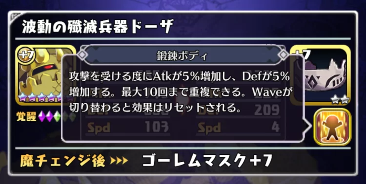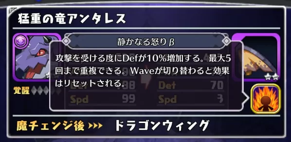 攻撃を受ける度にAtkが5%増加し、Defが5%増加する。最大10回まで重複できる。Waveが切り替わると効果はリセットされる