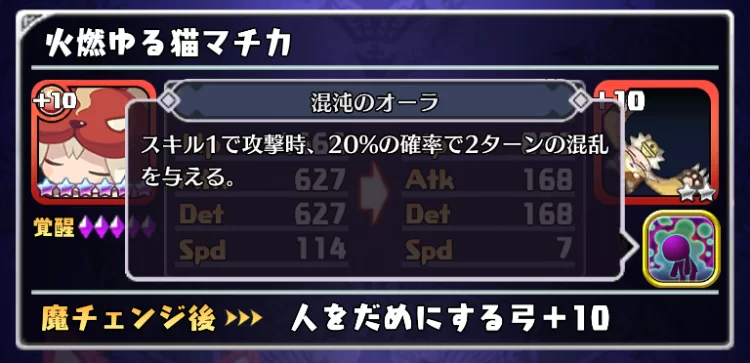 スキル1で攻撃時、20%の確率で2ターンの混乱を与える