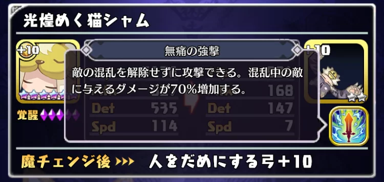 敵の混乱を解除せずに攻撃できる。混乱中の敵に与えるダメージが70%増加する