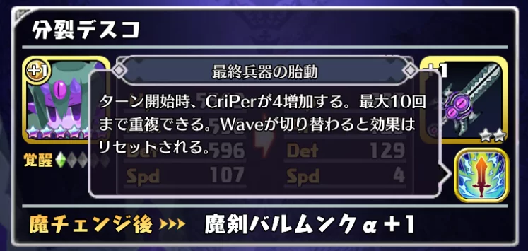ターン開始時、CriPerが4増加する。最大10回まで重複できる。Waveが切り替わると効果はリセットされる