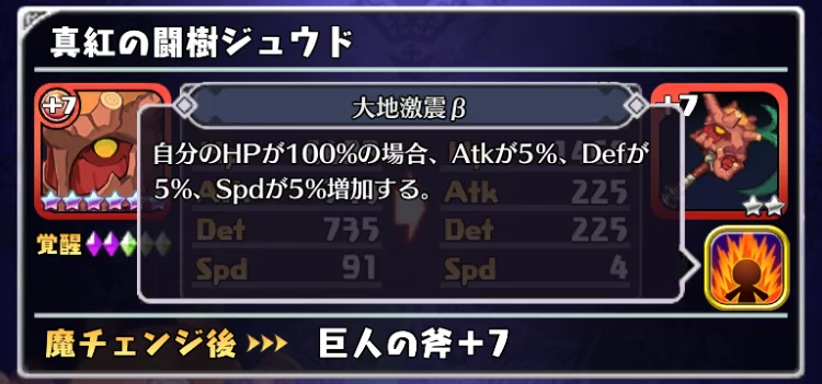 自分のHPが100%の場合、Atkが5%、Defが 5%、Spdが5%増加する