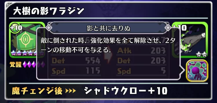 敵に倒された時、強化効果を全て解除させ、2ターンの移動不可を与える