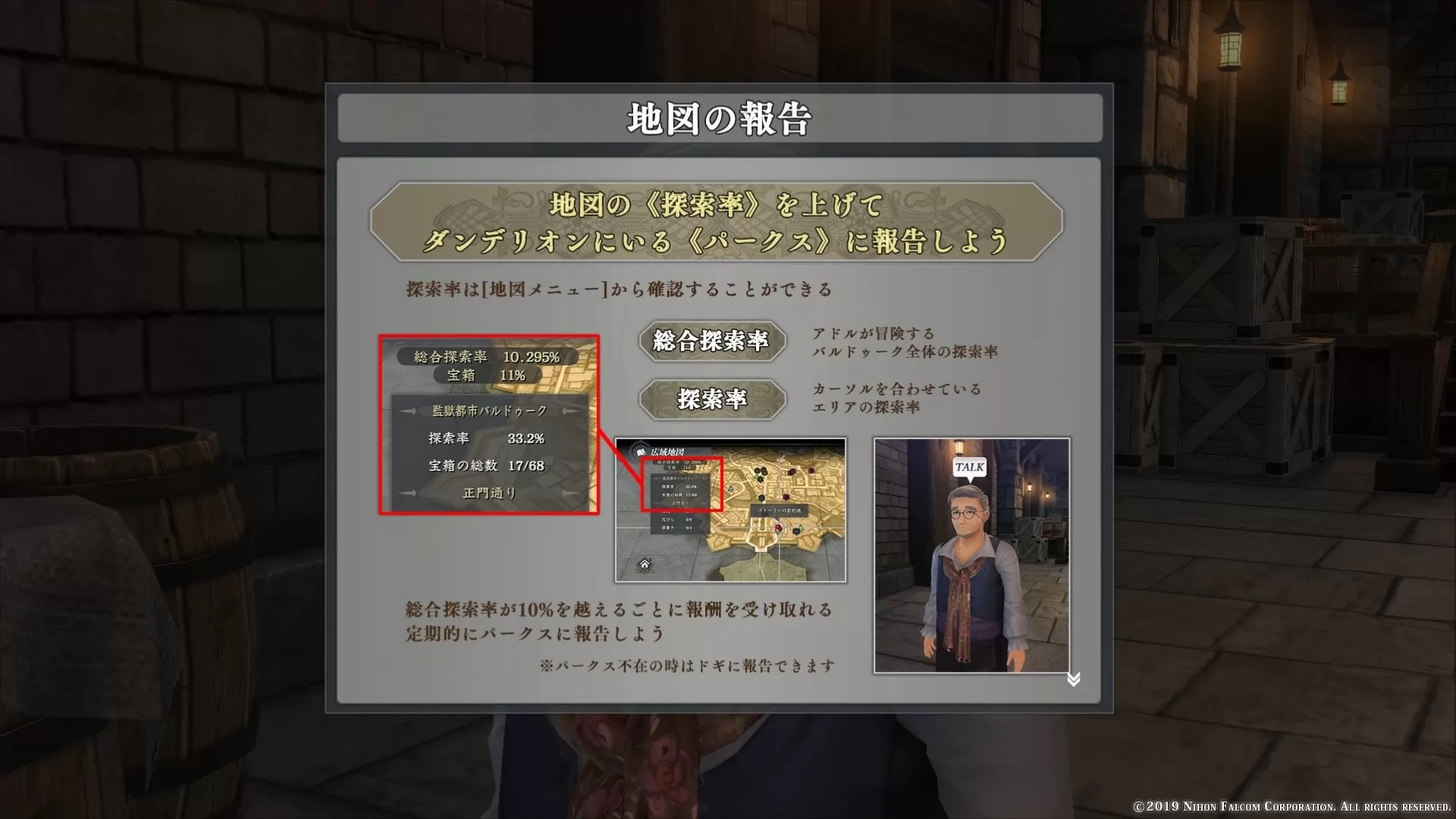 【イースⅨ】地図の報告報酬一覧 【イースⅨ】効率的なレベル上げ、経験値の稼ぎ方 2019.10.26 【イースⅨ】呪薬を使った効率的なステータス底上げの方法 2019.10.242019.10.26 【イースⅨ】ロケーションポイントの場所と報酬一覧 2019.10.192019.10.26 【イースⅨ】第7部「THE PRISON CRAZINESS~監獄狂騒曲~」攻略チャート 2019.10.142019.10.26 【イースⅨ】最終幕「MONSTRUM NOX~怪人たちの夜~」攻略チャート 2019.10.162019.10.26 イースⅨ 2019.10.22 地図報告による報酬を紹介その他、イースⅨの攻略記事はこちらスポンサーリンク 目次地図の報告報酬一覧地図の報告マップを探索すると、地図の探索率が上昇していく探索の成果はダンデリオンにいるパークスに報告することができる総合探索率が10%を超えるごとに報酬を受け取ることができるスポンサーリンク 報酬一覧割合報酬10%ライズポーション20%ブレイドリングⅡ30%力の呪薬40%鬼神の煉香50%流浪のマント60%フルポーション70%調合書<隠>80%鬼神の煉香90%調合書<守>100%偽書<煉>